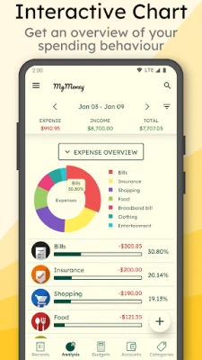 MyMoney का सरल और सहज इंटरफ़ेस आपके वित्तीय प्रबंधन के अनुभव को बेहद आसान बना देता है। आप अपने वॉलेट, बैंक कार्ड और बचत खातों को अलग-अलग प्रबंधित कर सकते हैं, क्योंकि MyMoney आपको असीमित खाते बनाने की स्वतंत्रता देता है। ऐप के प्रभावी विश्लेषण उपकरण साफ-सुथरे चार्ट और विस्तृत रिपोर्ट के माध्यम से आपकी मासिक आय और खर्चों का स्पष्ट अवलोकन प्रदान करते हैं। यह आपको अपनी खर्च करने की आदतों को गहराई से समझने और बेहतर वित्तीय निर्णय लेने में सक्षम बनाता है। अपनी व्यक्तिगत प्राथमिकताओं के अनुरूप, आप अपनी पसंदीदा मुद्रा, दशमलव स्थान, श्रेणी और खाता आइकन का चयन करके ऐप को पूरी तरह से निजीकृत कर सकते हैं। साथ ही, MyMoney में आपके डेटा को सुरक्षित रखने के लिए बैकअप और रीस्टोर सुविधाएँ भी शामिल हैं।